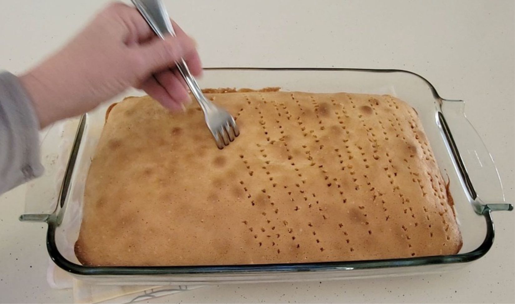 - After the cake has cooled slightly, use a fork to gently poke holes all over the top, spacing them evenly. Press fork all the way to bottom of pan.